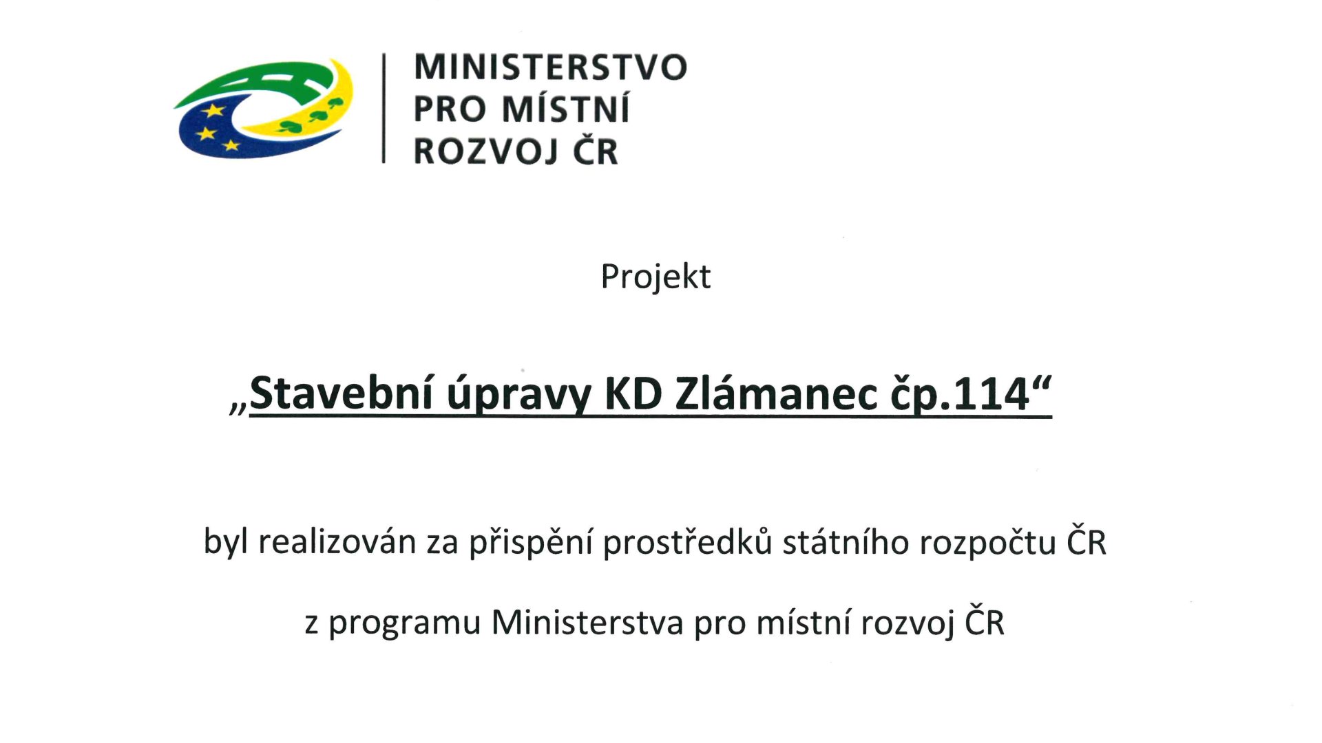 Projekt "Stavební úpravy KD Zlámanec čp. 114" je spolufinancován ze státního rozpočtu ČR